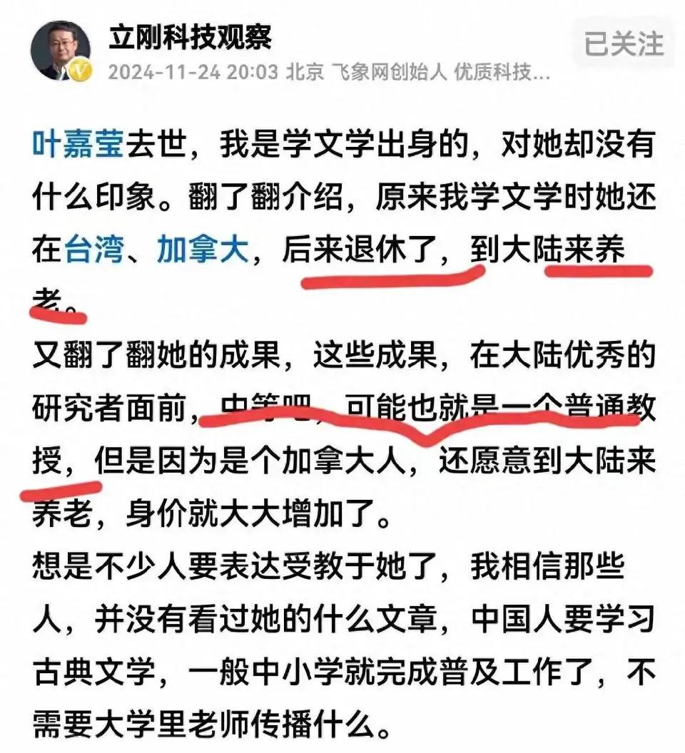 得知叶嘉莹女士去世诚信双赢,项立刚就大放厥词。