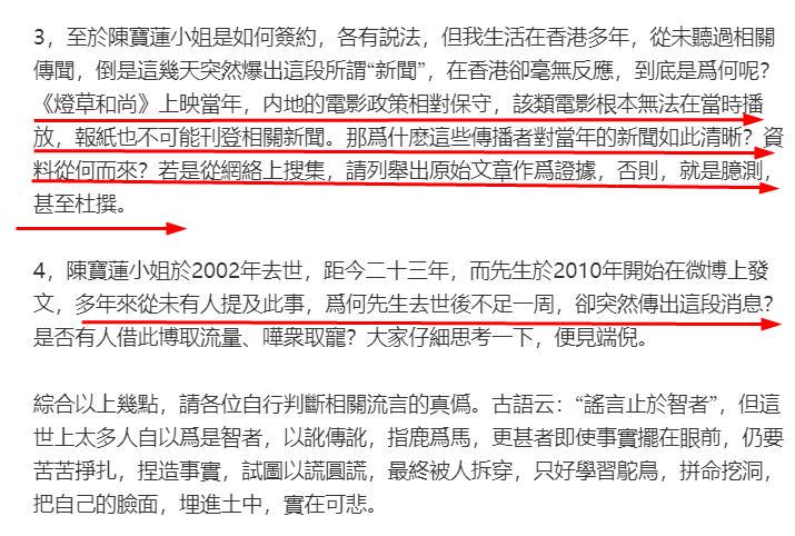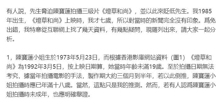 他“指控”蔡澜是靠风月片起家,说他做电影《灯草和尚》监制时,逼迫当时还未成年的陈宝莲拍风月片,还影射陈宝莲跳楼轻生与蔡澜脱不了干系。