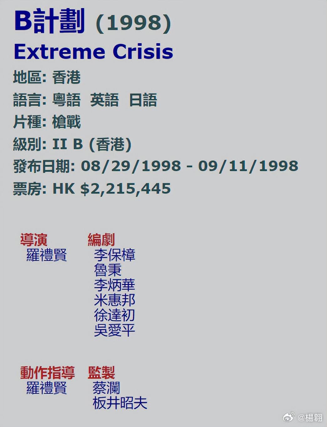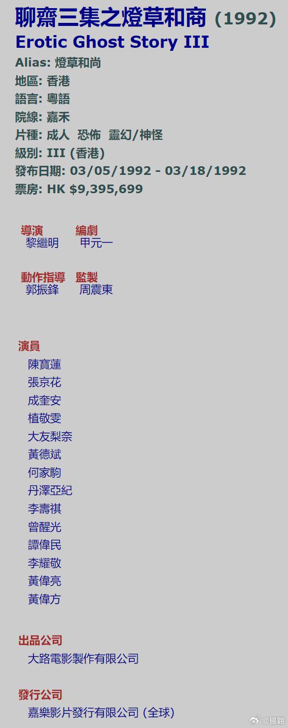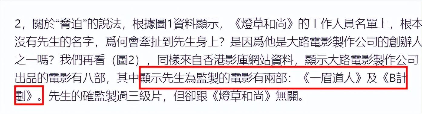 楊翱还晒出证据证明蔡澜并不是《灯草和尚》的监制,反而在创办大路电影公司期间,蔡澜只监制了2部电影,分别是《一眉道人》和《B计划》。