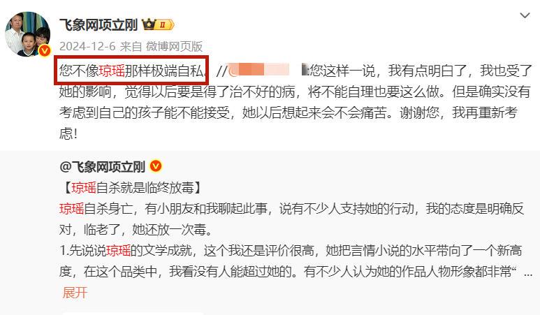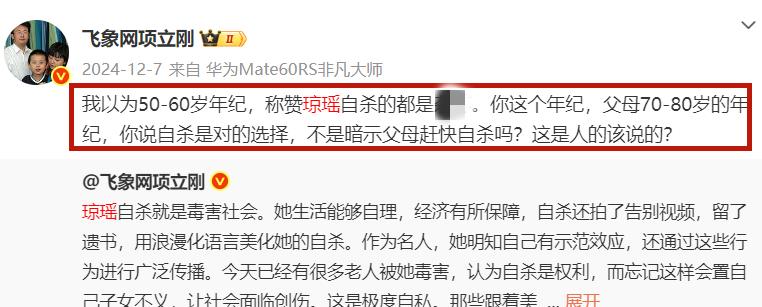 项立刚还说你要是赞成琼瑶的离世方式,就是暗示年迈的父母自杀。