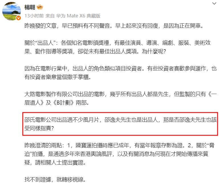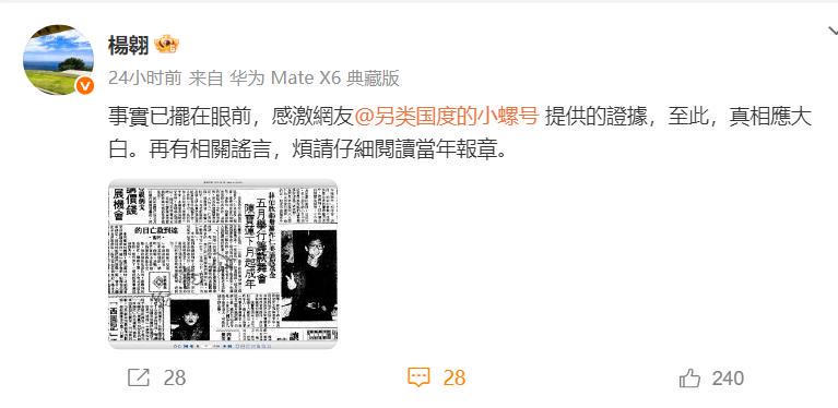 楊翱发证据证明当年陈宝莲拍摄《灯草和尚》时已经年满18岁,并不是未成年人。