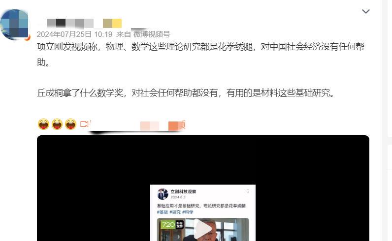 比如他否定数学家丘成桐在数学方面的研究,说对社会没有帮助。