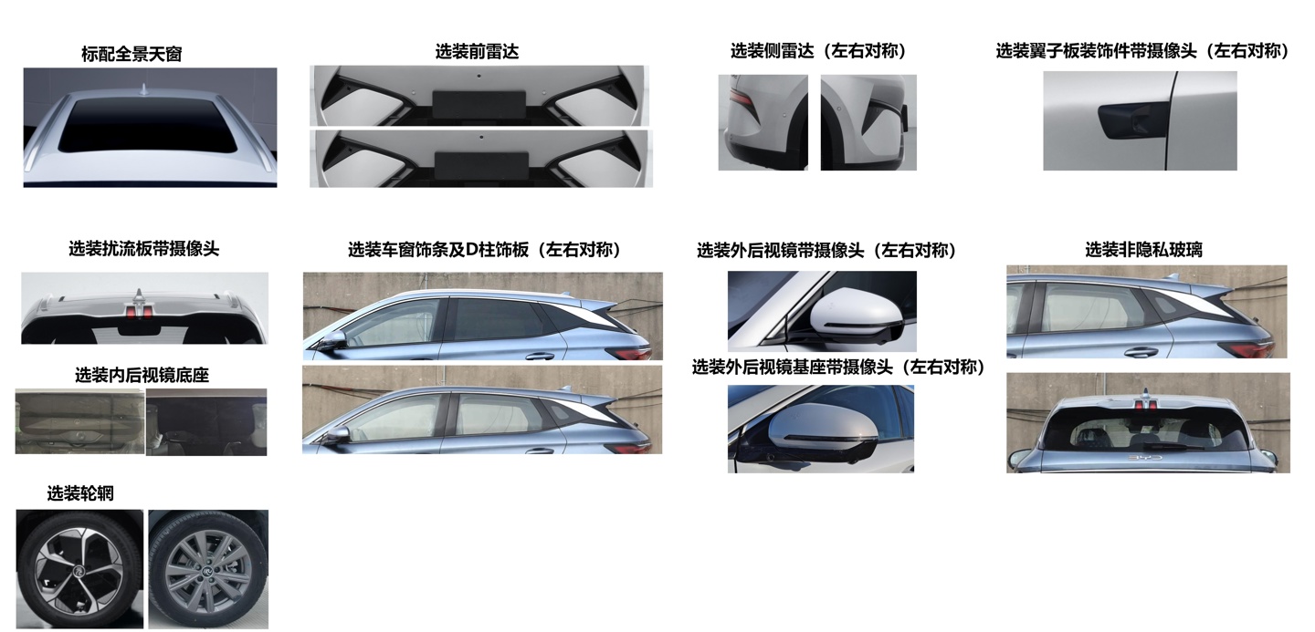 功能方面,这款汽车标配全景天窗,可选装前雷达、侧雷达、翼子板装饰件带摄像头、扰流板带摄像头、内后视镜底座、车窗饰条及 D 柱饰板、外后视镜带摄像头、外后视镜基座带摄像头、非隐私玻璃、轮辋。