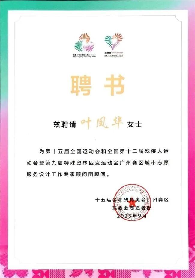 广工艺术与设计学院教授叶凤华受聘为第十五届全国运动会、第十二届全国残疾人运动会城市志愿者设计工作专家顾问团顾问,获志愿者服务组委颁发感谢信以表彰其专业贡献。