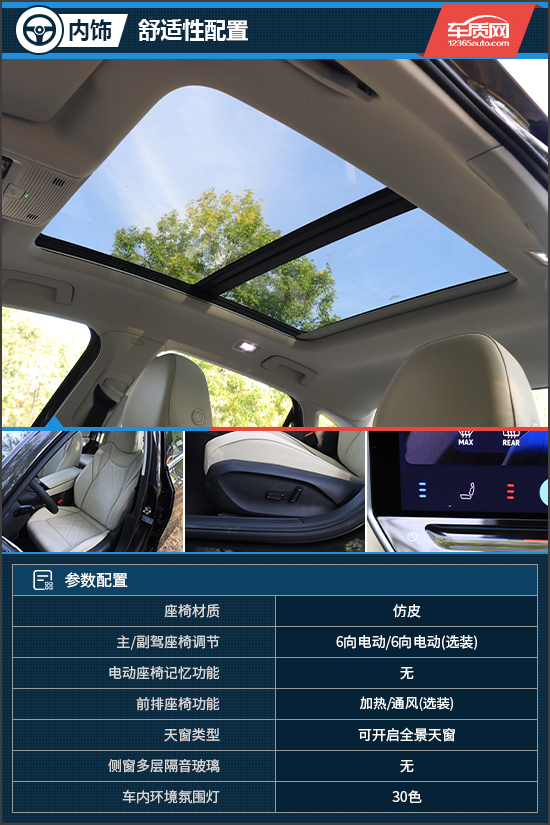舒适性配置方面,评测车配备了可开启全景天窗,面积宽大,有着出色的透光性。座椅虽然是仿皮材质,但填充物较为柔软,乘坐舒适性可圈可点。不过,评测车的前排座椅未配备加热和通风功能,均需要额外花钱选装,稍有遗憾。