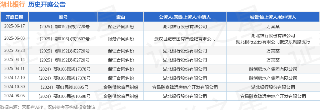 案号:(2025)鄂0192民初2720号审理法院:武汉东湖新技术开发区人民法院案由:保证合同纠纷当事人信息: 原告/上诉人:湖北银行股份有限公司 被告/被上诉人:万某某开庭日期:2025年6月17日根据统计,近一年内以湖北银行股份有限公司为当事人的历史开庭公告有8则,其中案由为“保证合同纠纷”的公告以5则居首,其次为“金融借款合同纠纷”有2则,“服务合同纠纷”有1则。历史开庭公告如下: