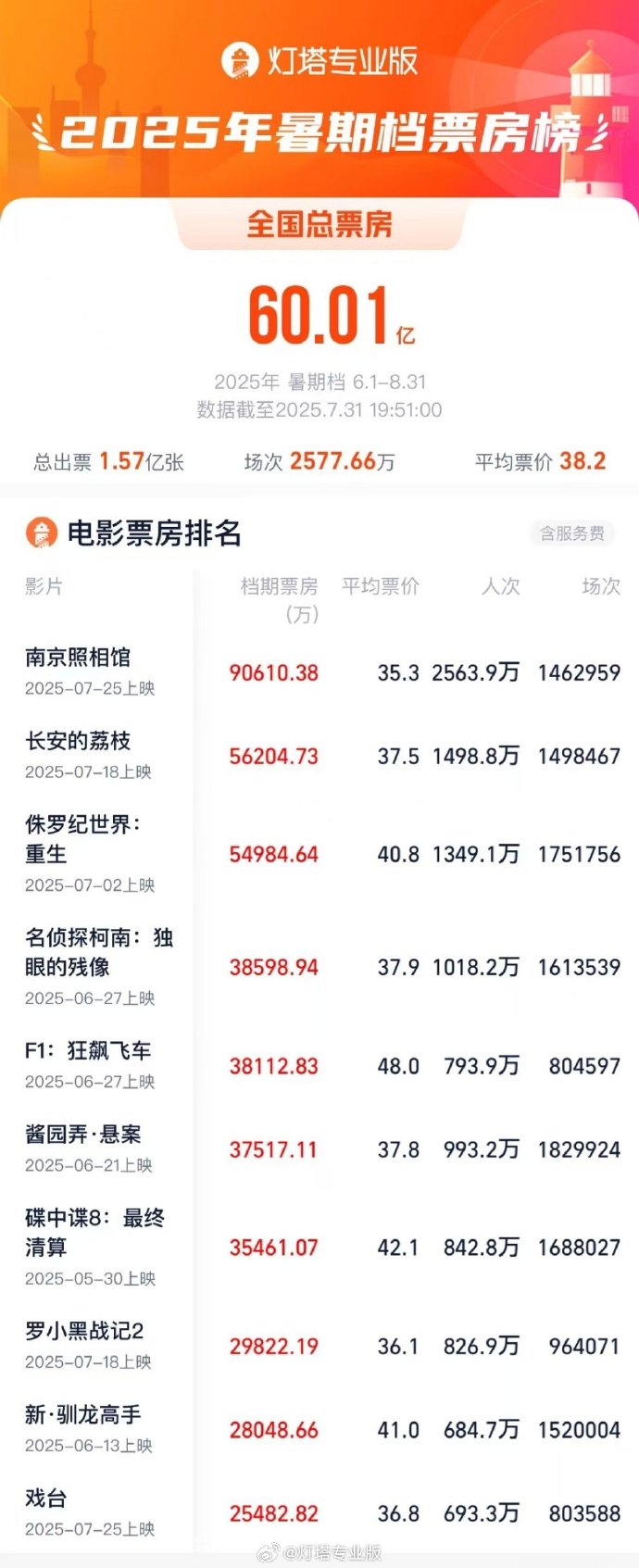 2025暑期档总票房破60亿2025暑期档总票房破60亿