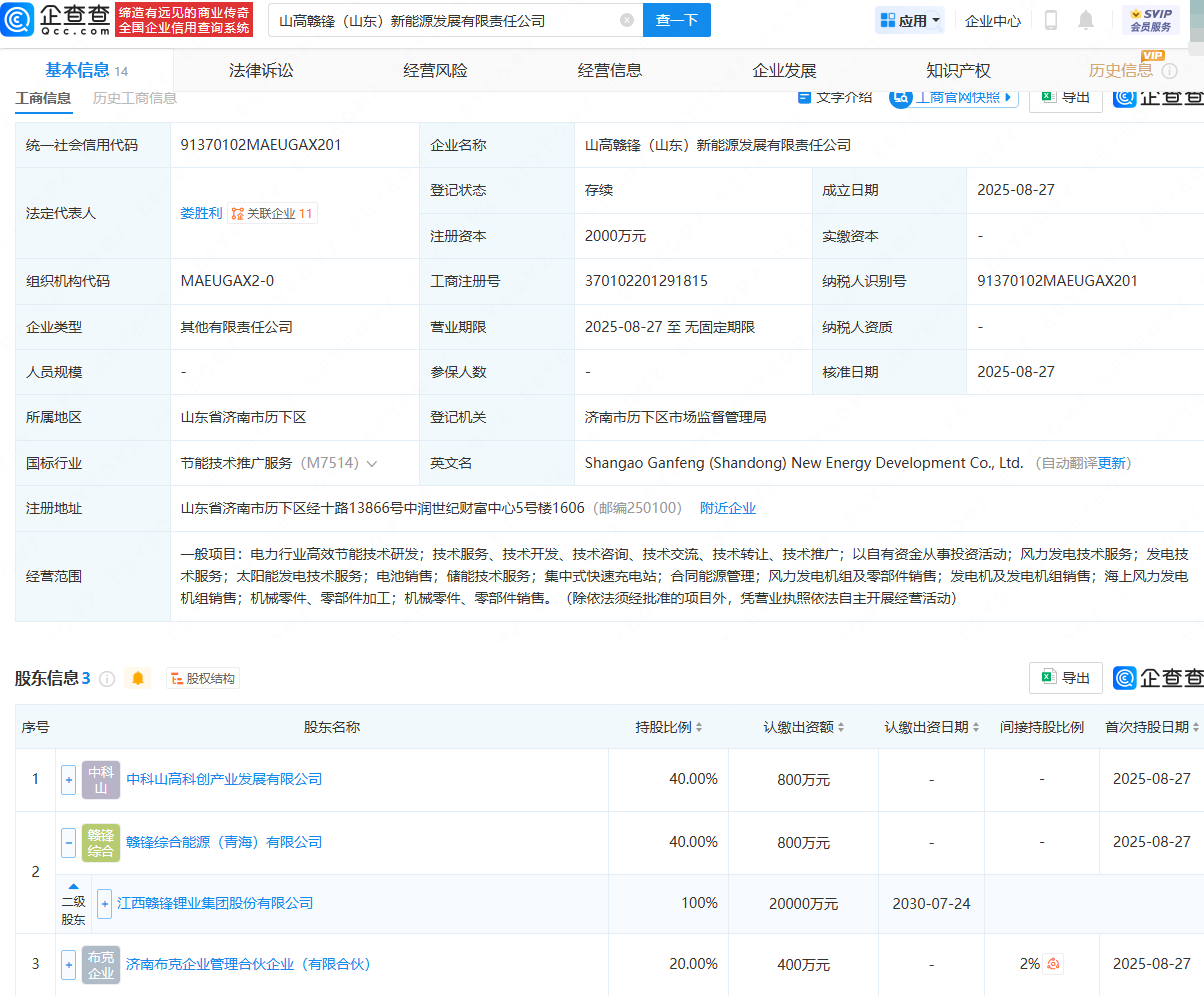 近日,山高赣锋(山东)新能源发展有限责任公司成立,法定代表人为娄胜利,注册资本为2000万元,经营范围包含:风力发电技术服务;电池销售;储能技术服务;集中式快速充电站;海上风力发电机组销售等。企查查股权穿透显示华利配资,该公司由中科山高科创产业发展有限公司、赣锋锂业(002460)全资子公司赣锋综合能源(青海)有限公司等共同持股。