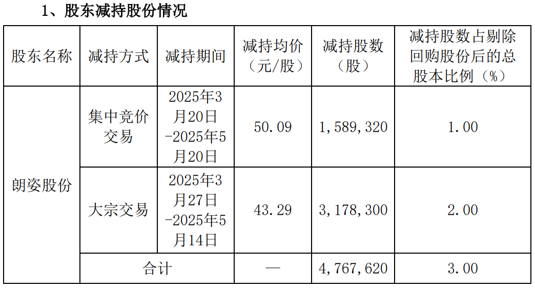 公告显示,朗姿股份减持股份来源为首次公开发行股票并上市前持有的公司股份(含首次公开发行后因资本公积转增股本而相应增加的股份)。2025年3月20日至2025年5月20日,朗姿股份共减持公司股份476.76万股,套现约2.17亿元。