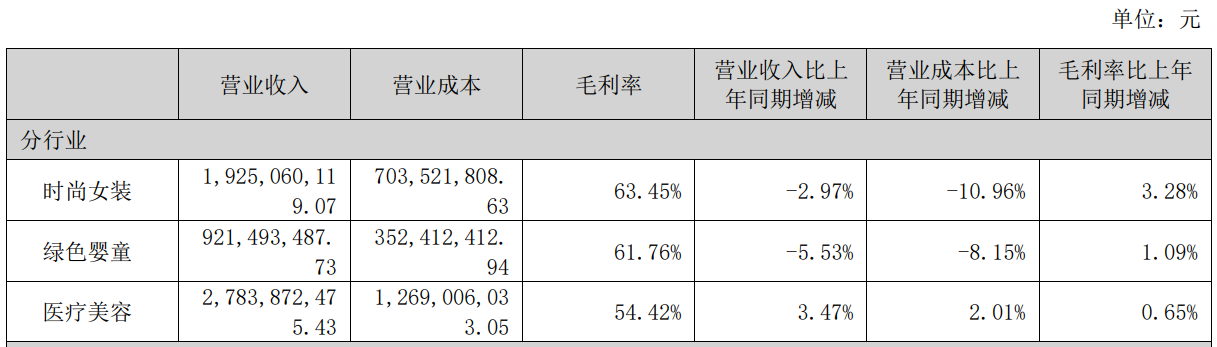 报告期内,公司女装业务板块实现营业收入19.25亿元,同比下降2.97%;实现毛利润12.22亿元,毛利率63.45%,同比增加3.28%。医疗美容业务板块实现营业收入27.84亿元,同比增长3.47%;实现毛利润15.15亿元,毛利率54.42%,同比增加0.65%。绿色婴童板块61.76%的毛利率表现和1.09%的增幅也强于医美业务。