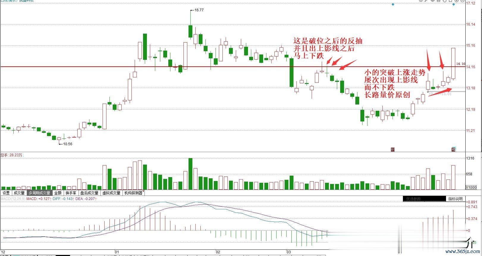 所以如果上影线是出现在刚破位之后的压力位下面,那么这种上影线就是一种明显的反抽走势。而如果出现上影线的位置是在前面不是破位,而是有了一个小的震荡上涨的走势。