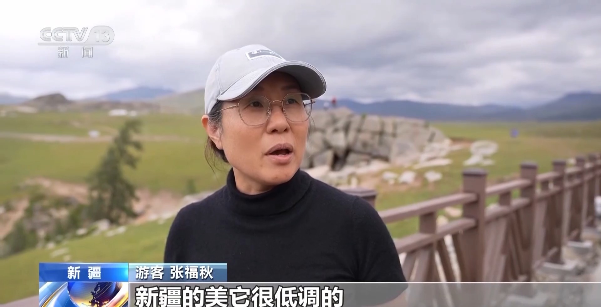 游客 张福秋:新疆的美,它很低调的,偶然转过一个弯,一下子就让你豁然开朗。心情特别好,我觉得很幸福。