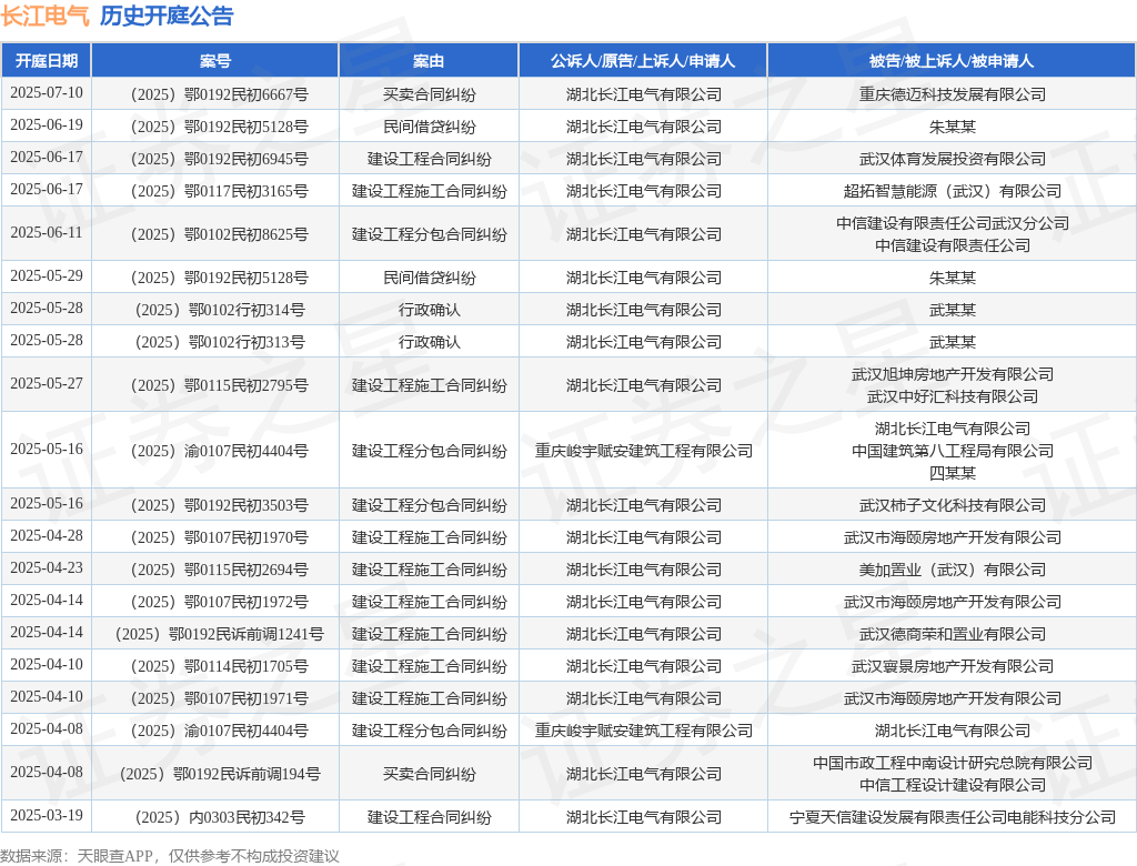 案号:(2025)鄂0117民初3165号审理法院:武汉市新洲区人民法院案由:建设工程施工合同纠纷当事人信息: 原告/上诉人:湖北长江电气有限公司 被告/被上诉人:超拓智慧能源(武汉)有限公司开庭日期:2025年6月17日根据统计,近一年内以湖北长江电气有限公司为当事人的历史开庭公告有51则,其中案由为“建设工程施工合同纠纷”的公告以22则居首,其次为“劳务合同纠纷”有7则,“建设工程分包合同纠纷”有5则。历史开庭公告(前20条)如下: